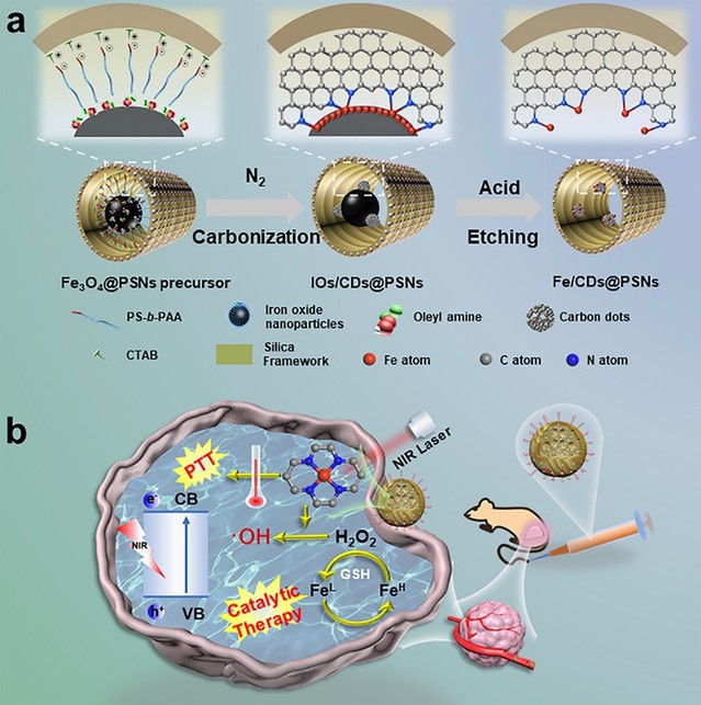 相较于大量关于碳基单原子体系在工业催化领域的研究,面向生物应用的单原子材料的构建探索仍处于起步阶段。因此,发展高效的生物用单原子体系在生物医药领域具有重大的临床应用潜力。基于此,该研究提出了一种简便通用的“界面限域配位”策略,在具有良好生物相容性的双介孔二氧化硅孔道内,构建金属单原子纳米治疗剂用于肿瘤的高效安全治疗。该研究利用多孔氧化硅纳米反应器中的孔道限域效应,通过原位高温碳化嵌段共聚物(聚苯乙烯-b-聚丙烯酸/PS-b-PAA)和含氮小分子(十六烷基三甲基溴化铵/CTAB和油胺)形成氮掺杂的碳点,再借助碳点与氧化铁纳米颗粒界面处的Fe-N-C配位作用及后续的酸刻蚀技术,实现硅基Fe单原子纳米治疗剂的可控精准构筑。基于受限介孔孔道中独特的Fe-N-C单原子结构,该硅基Fe单原子纳米治疗剂在外源性近红外光辐照下具有高效的光热转换能力,其光热转换效率可达58.1%,是传统碳基光热试剂(不含单原子结构)的3倍之多。DFT计算进一步揭示了孔道限域环境下单原子结构增强碳基材料光热性能的内在机制,主要源于孔道内单原子锚定的缺陷碳结构中电子密度增加、带隙减小。此外,孔道中的Fe单原子结构还具有pH/GSH双触发的肿瘤微环境响应催化治疗能力,即可将内源性双氧水转化为羟基自由基来杀伤肿瘤细胞,并在细胞和活体层面分别论证了该硅基Fe单原子纳米治疗剂在高效肿瘤光热/催化治疗方面的应用潜力。该工作将为设计和精准构建具有可调变金属成分的多功能单原子纳米治疗剂,以实现安全有效的肿瘤治疗,提供了新的思路和科学指导。