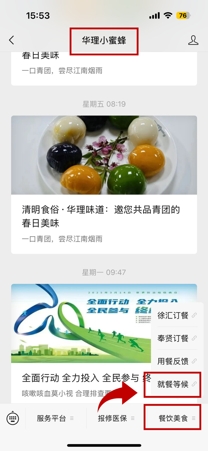 进入【华理小蜜蜂】公众号→菜单栏选择【餐饮美食】→点击【就餐等候】进入系统